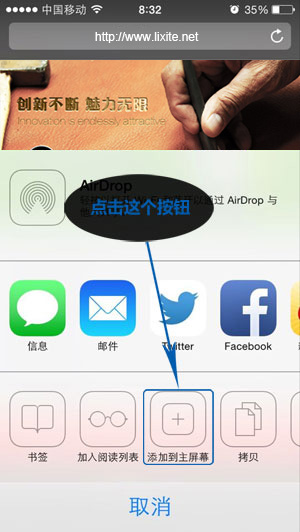 (3)在打开的栏目中选择"添加到主屏幕"